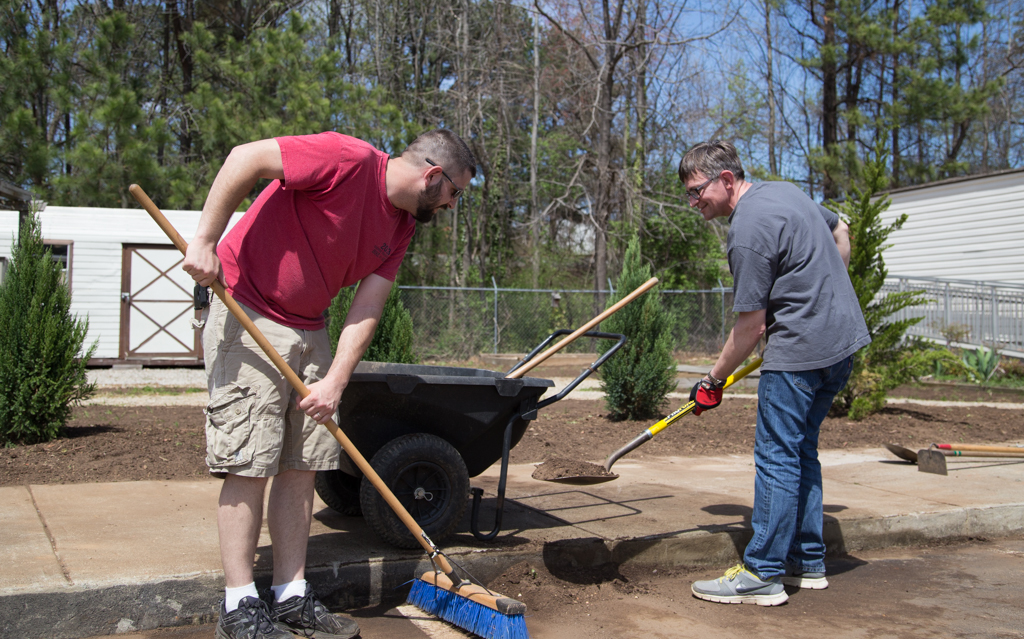 Glenn and Chris clean the last of the garden soil off of the parking lot